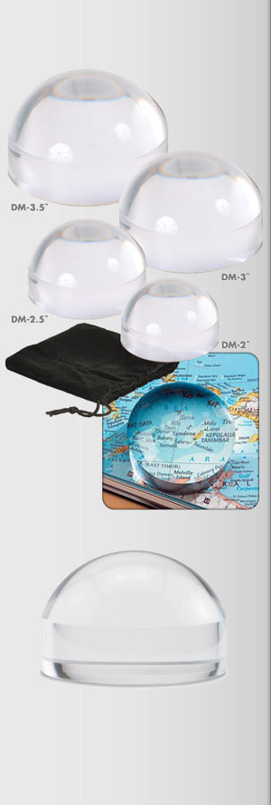 A dome magnifier, also known as a hemispherical magnifier, is a light gathering magnifier that is uniquely shaped in a half circle. They are constructed from pressure formed and polished solid acrylic. This provides distortion-free pre focused 3x-4x magnifying power, depending on model chosen. (see below) The unique design allows these dome magnifiers to glides effortlessly across a smooth reading surface and makes reading small print a pleasure; because they are pre-focused you simply place the magnifier directly on the item to be viewed. Their design allows ambient light to be drawn in from all sides and naturally illuminates your magnification surface, making the dome magnifier the perfect optical tool for enhanced reading of magazines, newspapers, maps, contracts, architecture plans and other reading material. The magnifying glass is self-focusing to provide superlative image clarity. Dome magnifiers are an ideal reading aid for the visually challenged, and the 3.5 inch is large enough to magnify the entire newspaper column of most newspapers into one field of view.