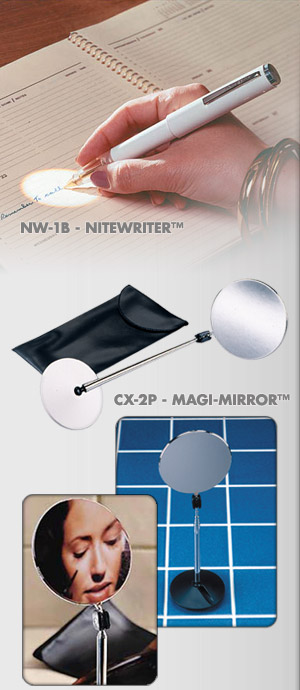 Magi-Mirror™ Fog-resistant, unbreakable travel mirror with travel pouch. Extends up to 30 inches. Swivels from regular to magnifying. Great for inserting contact lenses, shaving, applying eye make-up, etc. Attaches to any smooth glass or tile surface.